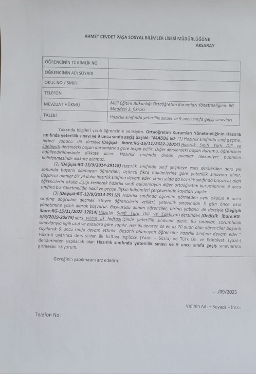 2- Veli, öğrencisinin yeterlik sınavına katılması için Yeterlilik sınavının yapılacağı günden 5(beş) gün öncesine kadar okulumuza dilekçe ile başvuracaktır.